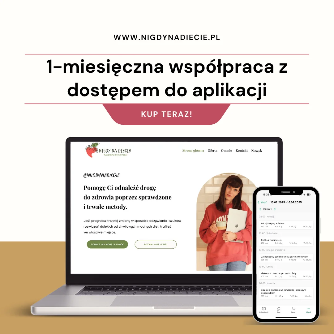 Miesięczna współpraca z indywidualnym planem żywieniowym, regularnymi konsultacjami i stałym wsparciem.